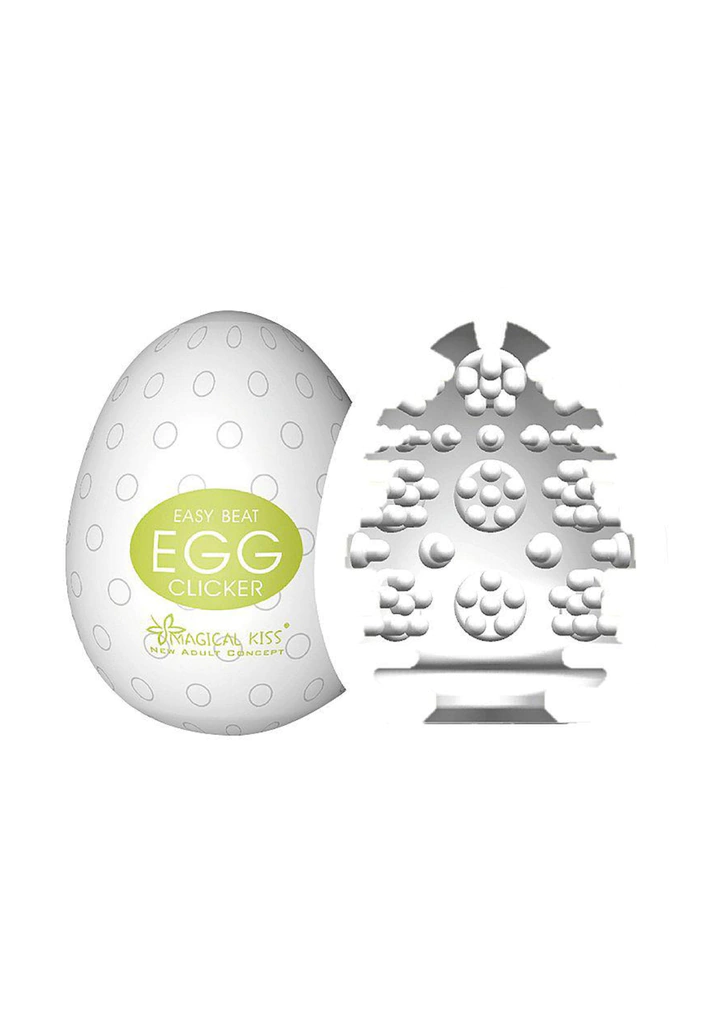 Dentro da embalagem em forma de casca, você encontra uma peça de silicone que imita um ovo, porém oca e com um orifício na base.